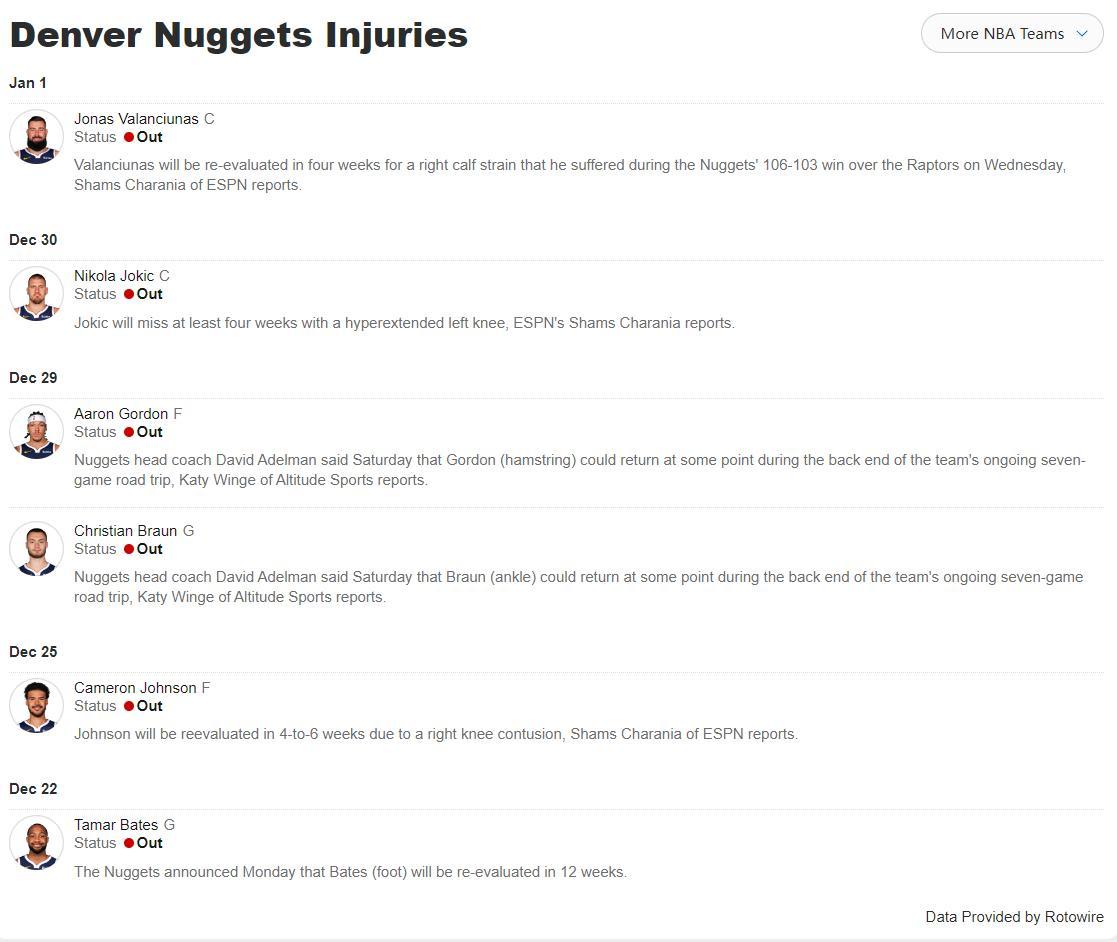 掘金非常之慘,先發的約基奇、戈登、卡梅倫-約翰遜、布勞恩都傷了,替補的中鋒瓦蘭也傷了,換言之核心輪換傷了5人,小阿德爾曼不得不擺出穆雷、沃特森、斯潘塞-瓊斯、霍姆斯、皮克特的先發陣容,這套陣容有把握的實際上只有穆雷一人。