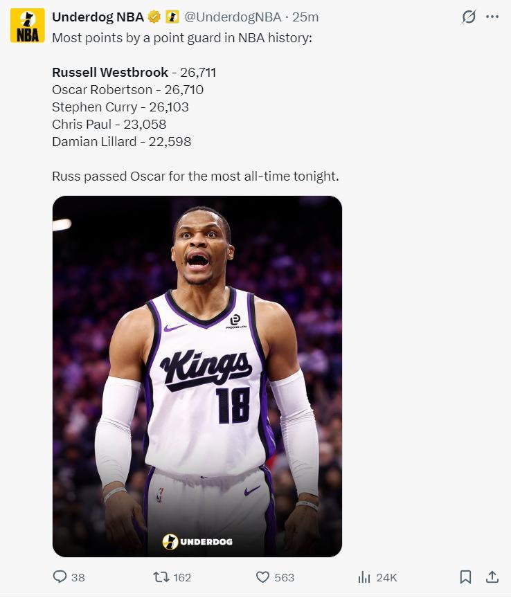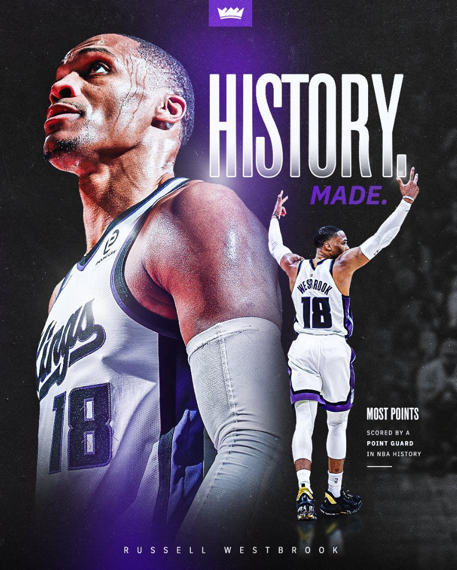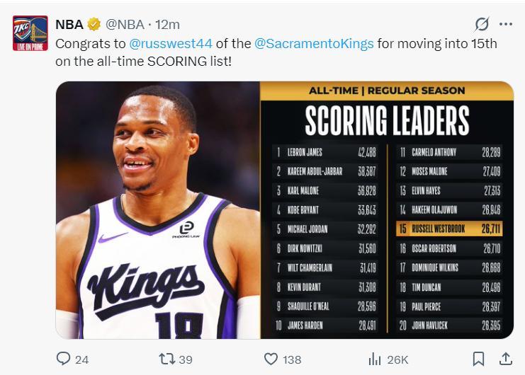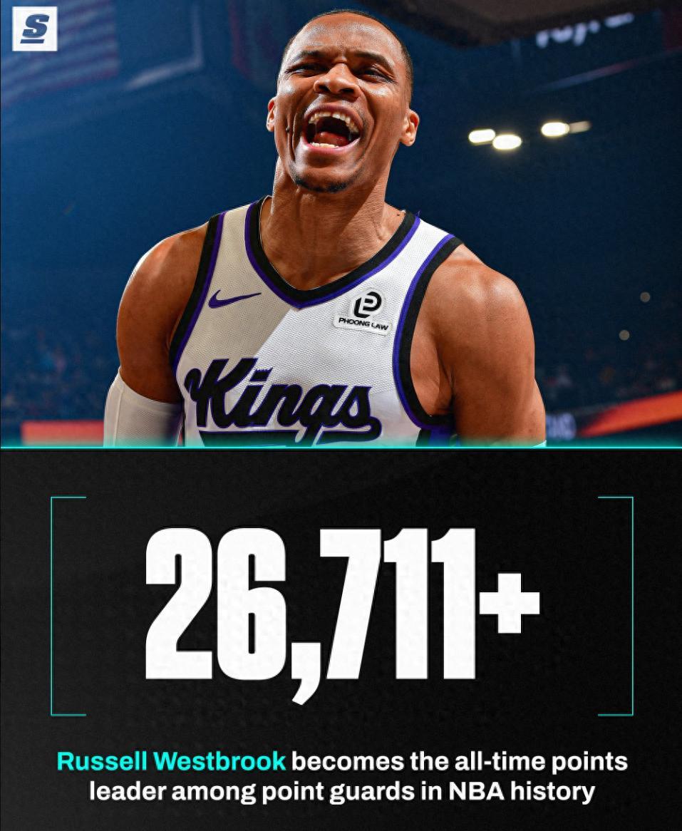 北京時間1月3日,國王102-129慘敗太陽,這是一場毫無懸念的比賽,太陽一直牢牢掌控局勢,末節更是一波32-19將國王按在地板上摩擦。37歲的威少這場比賽卻迎來了里程碑的夜晚,他的歷史總得分超過26711+超過大O,成爲歷史控衛得分王。
