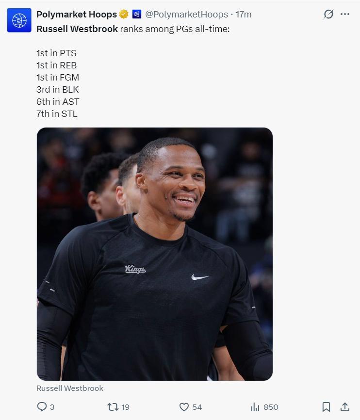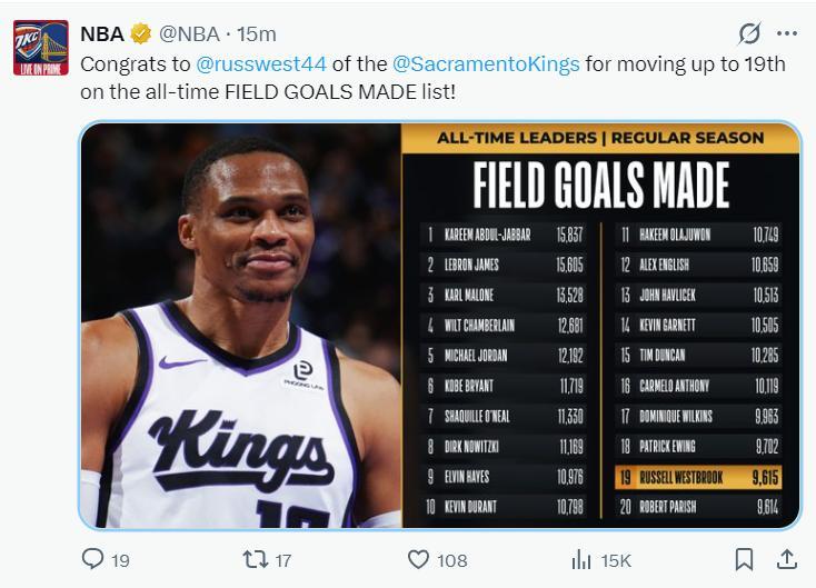 此役威少的里程碑還不止一項,他的運動戰進球9615個也升至歷史第19位。