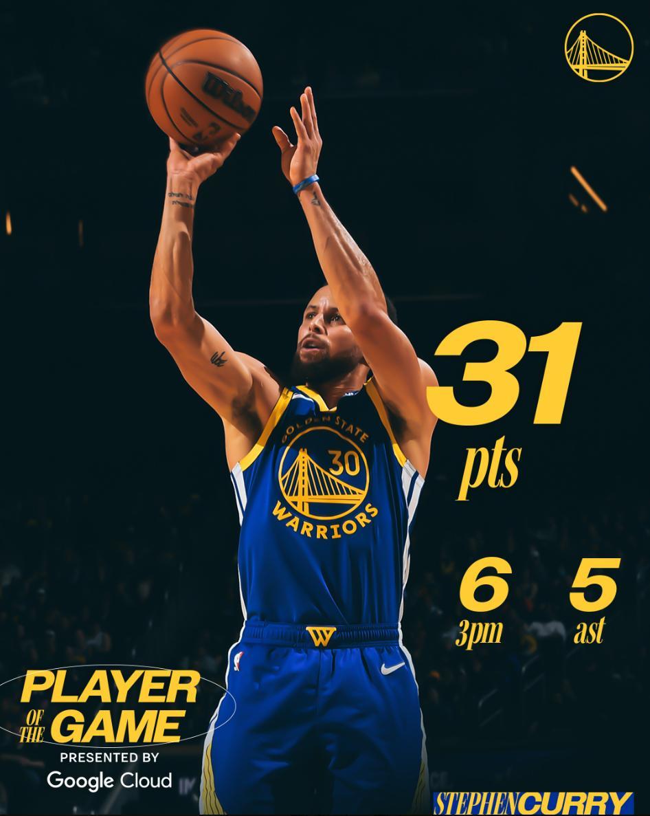 這場比賽庫裏34分鐘,18中8,三分12中6,罰球9中9,拿到31分5助攻2籃板1搶斷,命中率44.4%,三分命中率50%,真實命中率70.6%,正負值+5。