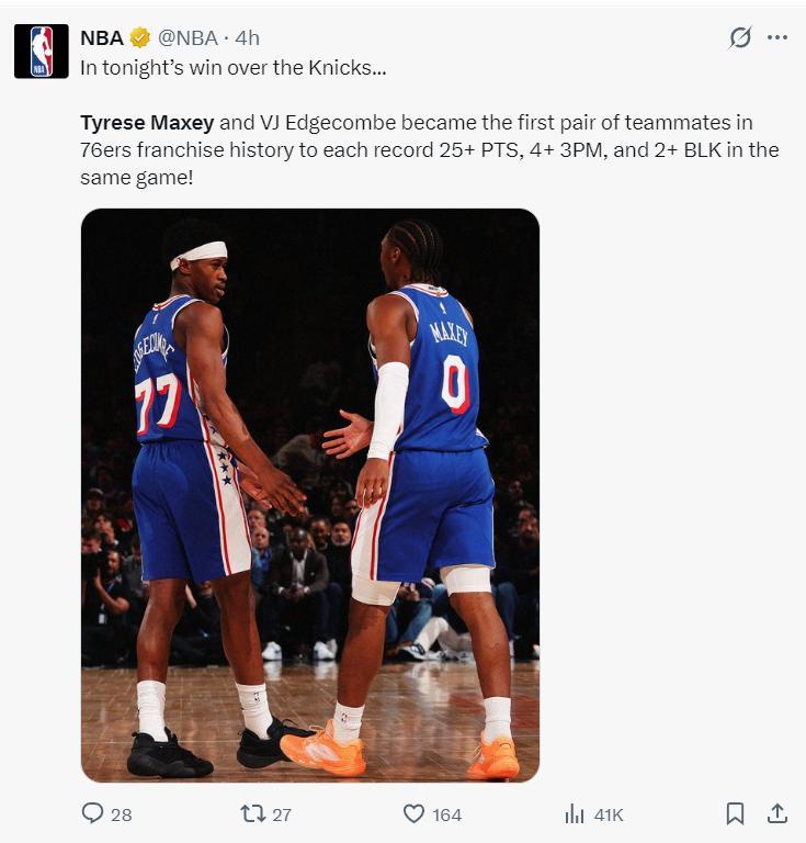 此役他與埃奇庫姆成爲費城隊史首對拿到25+4三分+2蓋帽的組合。