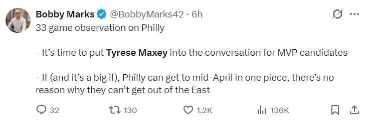 ESPN薪資結構專家鮑比-馬克斯:是時候將馬克西納入MVP候選人行列了,假設費城進入4月中旬全隊都保持健康,那麼他們沒有理由不衝出東部。