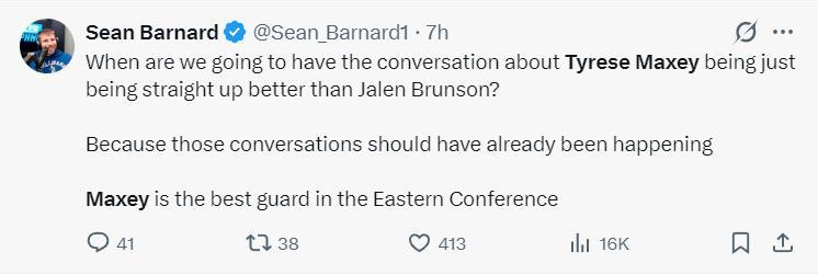 NBA記者Sean Branard寫道:我們應該好好聊聊一個問題,那就是馬克西與布倫森兩人誰更出色,我認爲馬克西已經是東部最出色的後衛。