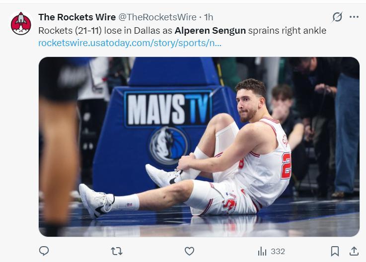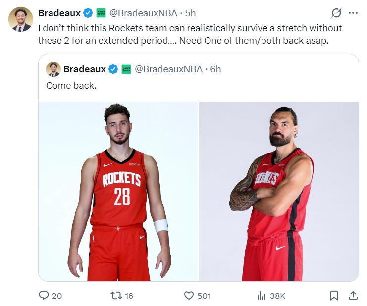 亞當斯自12月30日後就因爲腳踝傷勢進入傷病名單,火箭記者Bradeaux寫道:我認爲火箭若長期缺少這兩位球員,恐怕很難撐下去,急需阿爾佩倫-申京和史蒂文-亞當斯其中一人/兩人儘快歸隊。