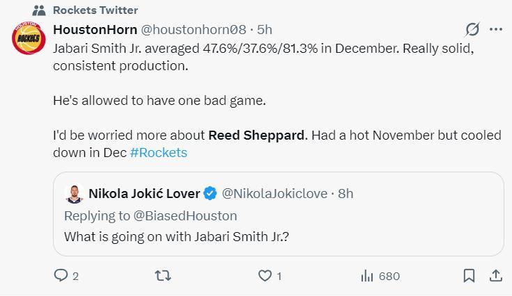 休媒:我們允許小賈巴里-史密斯拉胯一戰比賽,因爲他12月份命中率47.6%,三分命中率37.6%,但謝潑德經歷了11月的火熱後12月就開始狀態大跌,糟糕的狀態還延續到了一月份。