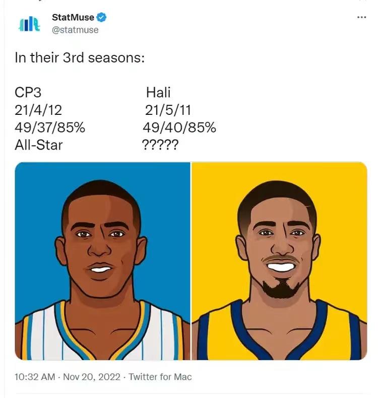 根據StatMuse體育網站統計,他本賽季的數據,和同時期的保羅幾乎完全一致。