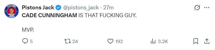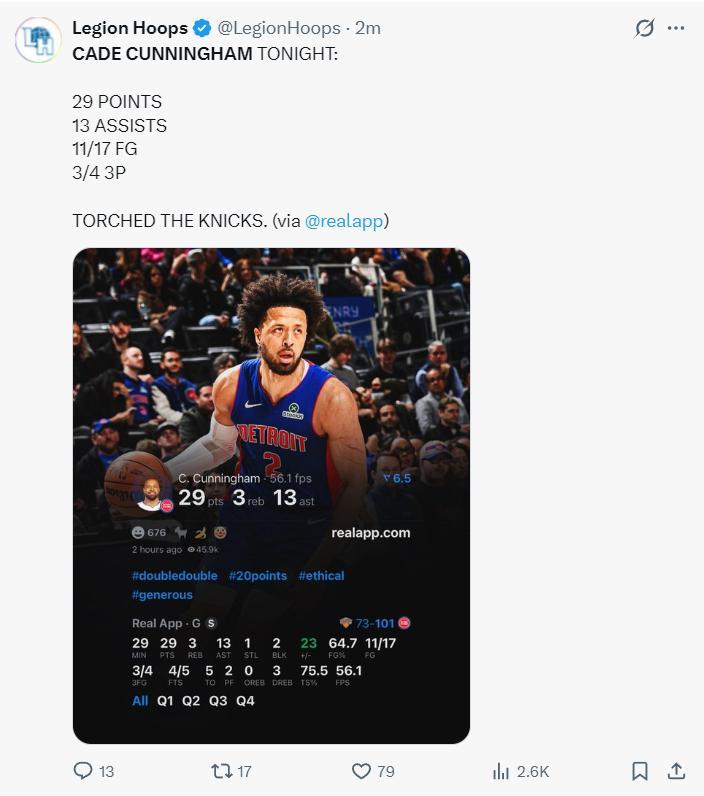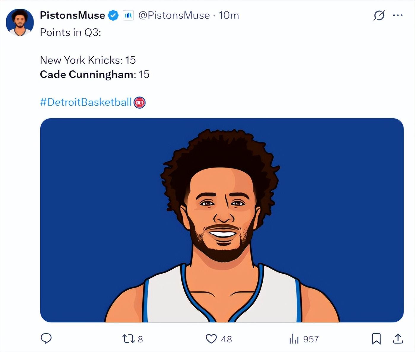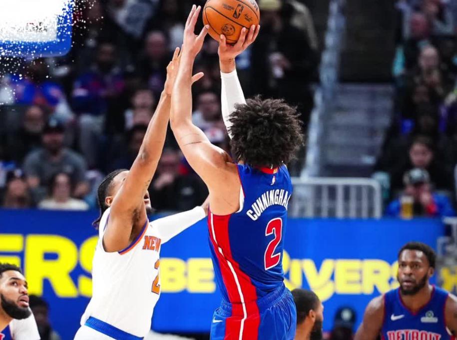 第二節坎寧安的輪換階段他的發揮不多,但全隊的士氣已經起來了,這一節活塞單節淨勝9分,第三節纔是CC發揮的節次,他10分鐘裏8中5+三分2中2拿到15分2助攻1籃板1蓋帽,尼克斯全隊第三節才15分。