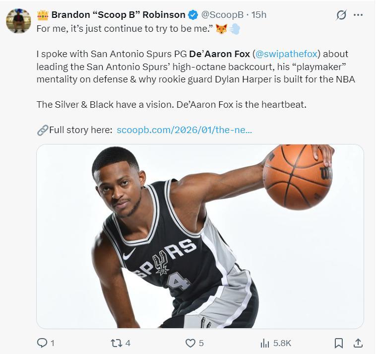 在這場比賽之前,福克斯剛剛接受了Scoop B的專訪,福克斯表示在馬刺這支充滿後場球員的球隊打球最主要的是做自己,在防守端也要有組織者的心態,會幫助哈珀更快的適應NBA的節奏。【結果福克斯就是用18中4來做自己】