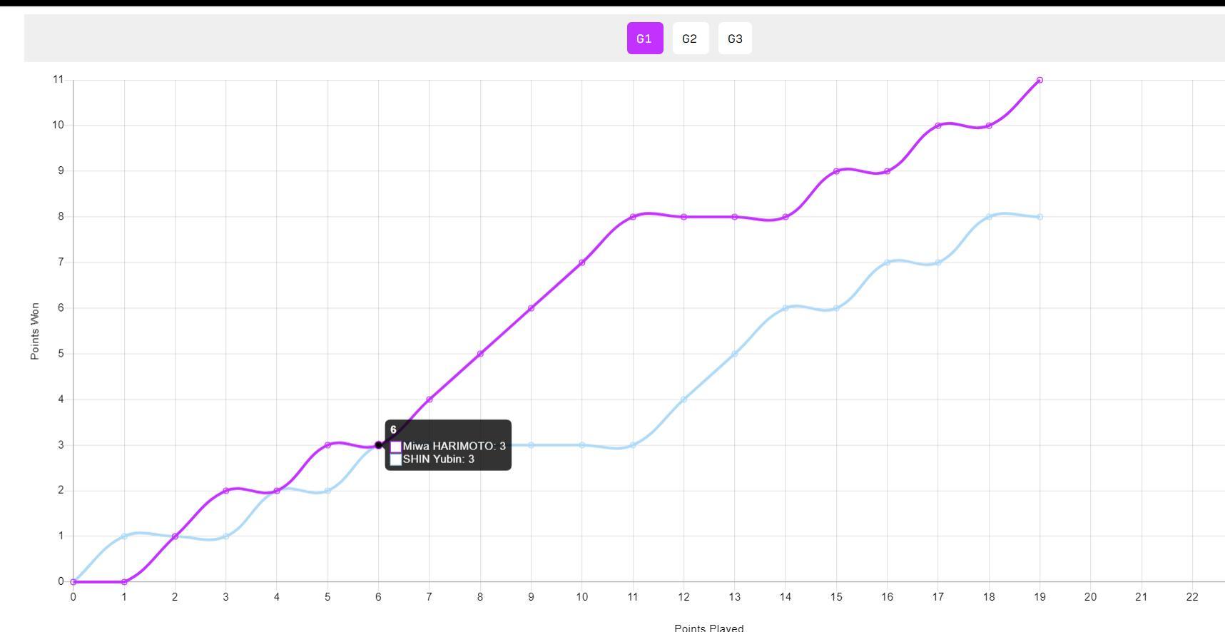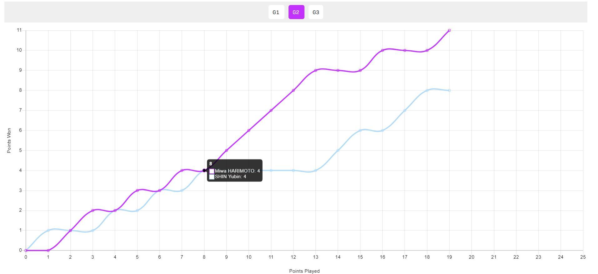 第一局兩人打到3-3後申裕斌就崩盤了,張本美和是一波5-0直接8-3領先申裕斌,雖然申裕斌回應一波3-0追到6-8,但張本美和穩定心神9-6,最終是10-7拿到局點,11-8拿下勝利。