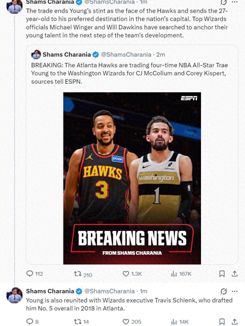 北京時間1月8日,根據ESPN記者Shams的報道,奇才與老鷹達成交易,老鷹將特雷楊送到奇才換取麥科勒姆、基斯珀特,這筆交易只是1換2,換言之特雷楊的交易價值是負面的。
