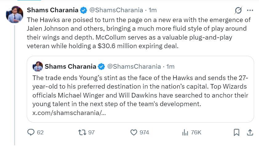 根據Shams的說法,老鷹這一舉動是因爲新鷹王傑倫-約翰遜的崛起,老鷹管理層看到了一衆年輕球員的未來,特雷楊尺寸不足與防守短板已經不適合這支身高臂長具有運動能力的球隊,27歲正值當打之年的全明星後衛特雷楊的老鷹時代結束了。