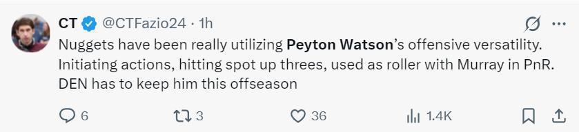 美媒:目前的掘金非常依靠沃特森的多樣性,他能發起進攻、命中空位三分,他跟穆雷的擋拆可以順下攻框,掘金必須留住他。