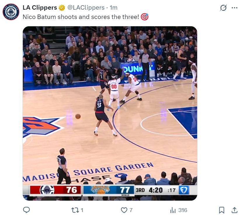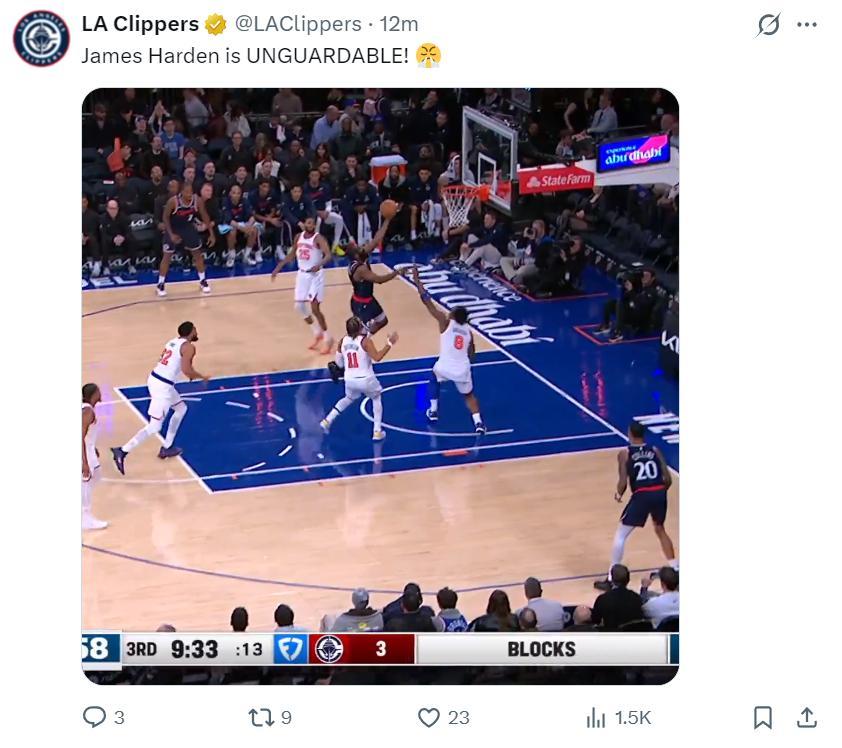 第三節哈登6中2+三分2中1+罰球4中4拿到9分1籃板3助攻1搶斷,三節打完21分8助攻3籃板2搶斷,而倫納德第三節只拿到4分,三節打完25分1籃板1助攻,快船已經被尼克斯反超。
