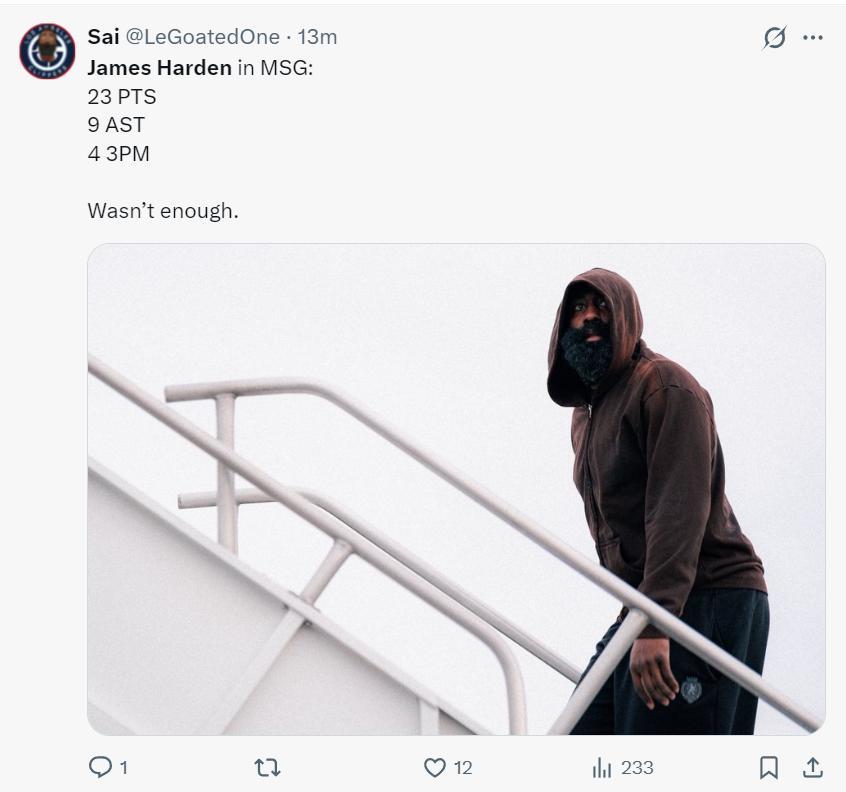 末節,哈登、小卡兩個核心一同啞火了,兩人合計是7中1,只有哈登命中了一個運動戰進球,末節兩人合計只有2分,哈登的命中率還更低一些,最終尼克斯完成了大逆轉,哈登這場比賽肯定又要背鍋了。