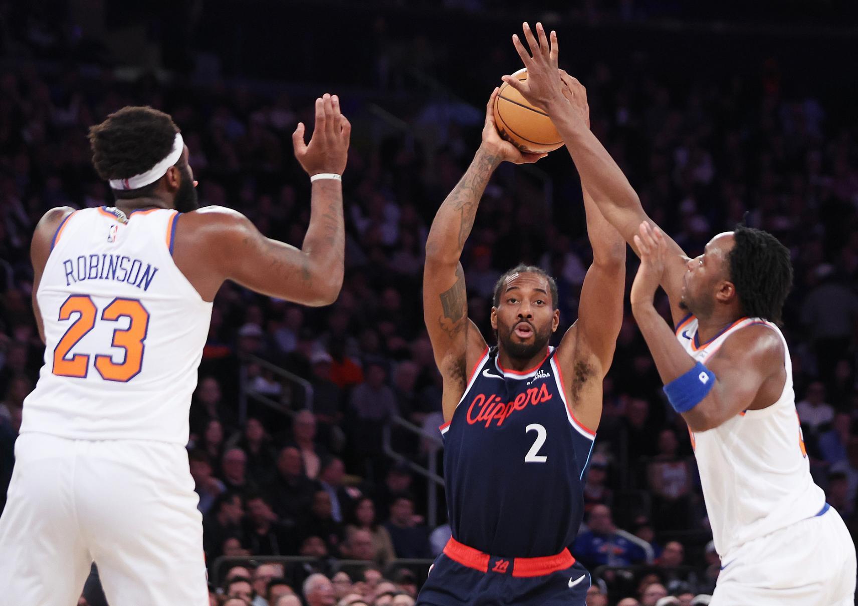 好景不長啊,下半場開始尼克斯對萊昂納德的防守策略變了,他們放棄去夾擊持球人哈登,開始在小卡運球進入三分線內後的雙人包夾,萊昂納德兩個回合都未能獲得出手的機會,第三節打了7分鐘只拿到4分1助攻1搶斷,快船也被尼克斯反超。