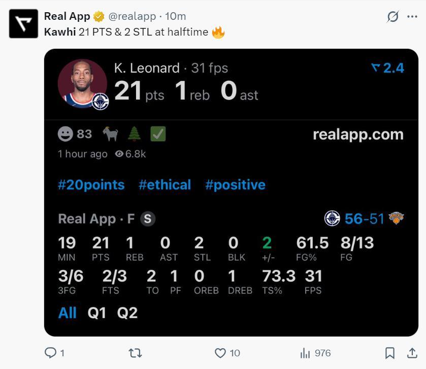 第二節小卡直接暴走,開啓了戰神卡模式,單節12分鐘,9中6+三分4中2+罰球2中1拿到15分1籃板2搶斷,半場僅僅19分鐘,13中8+三分6中3,拿到21分1籃板2搶斷,萊昂納德一旦進入Zone模式就很難擋住。