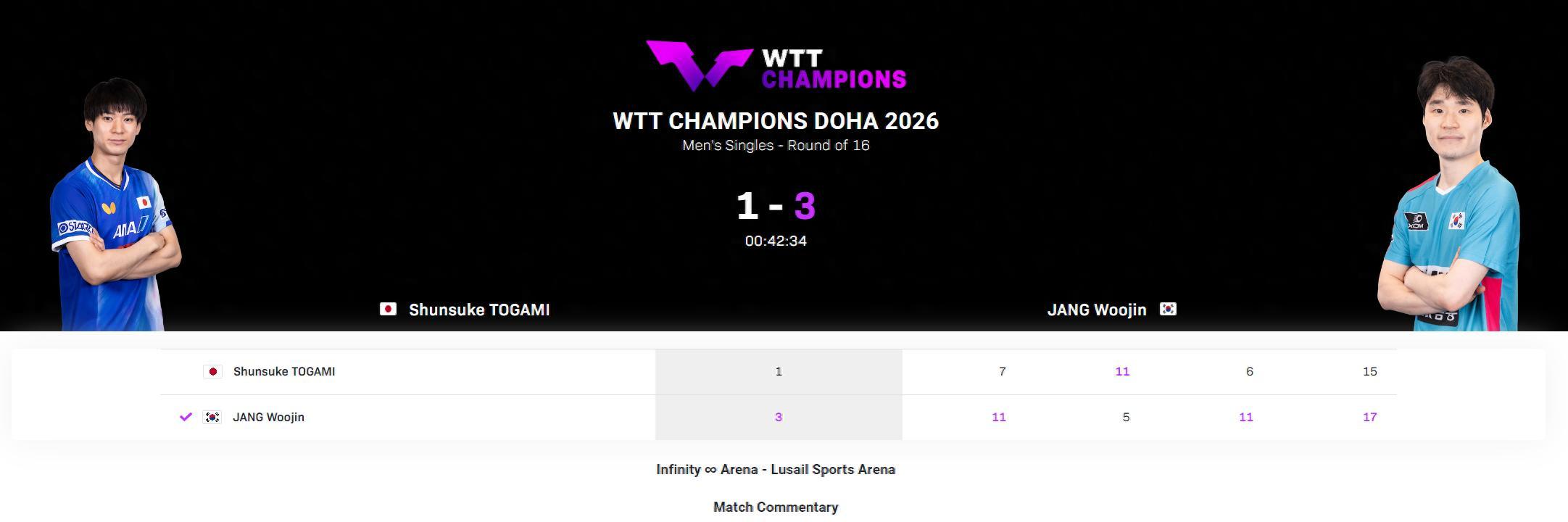 北京時間1月9日,WTT多哈冠軍賽男單1/8決賽,韓乒選手張禹珍3-1擊敗日乒選手戶上隼輔,四局比分:11-7,5-11,11-6,17-15。這場比賽第四局兩人鏖戰32分張禹珍涉險過關,張禹珍也是韓乒唯一進入本站男單八強的選手。