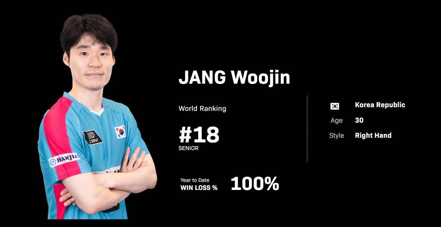 30歲的張禹珍是韓乒唯一的曙光,因爲在首輪打完安宰賢1-3周啓豪,吳晙誠0-3邱黨,只有張禹珍3-2爆冷擊敗了艾利克斯-勒布倫晉級次輪,五局比分:13-11,11-5,14-16,6-11,11-6。30歲的張禹珍是韓乒世界排名第二高的選手,他目前的世界排名是第19。