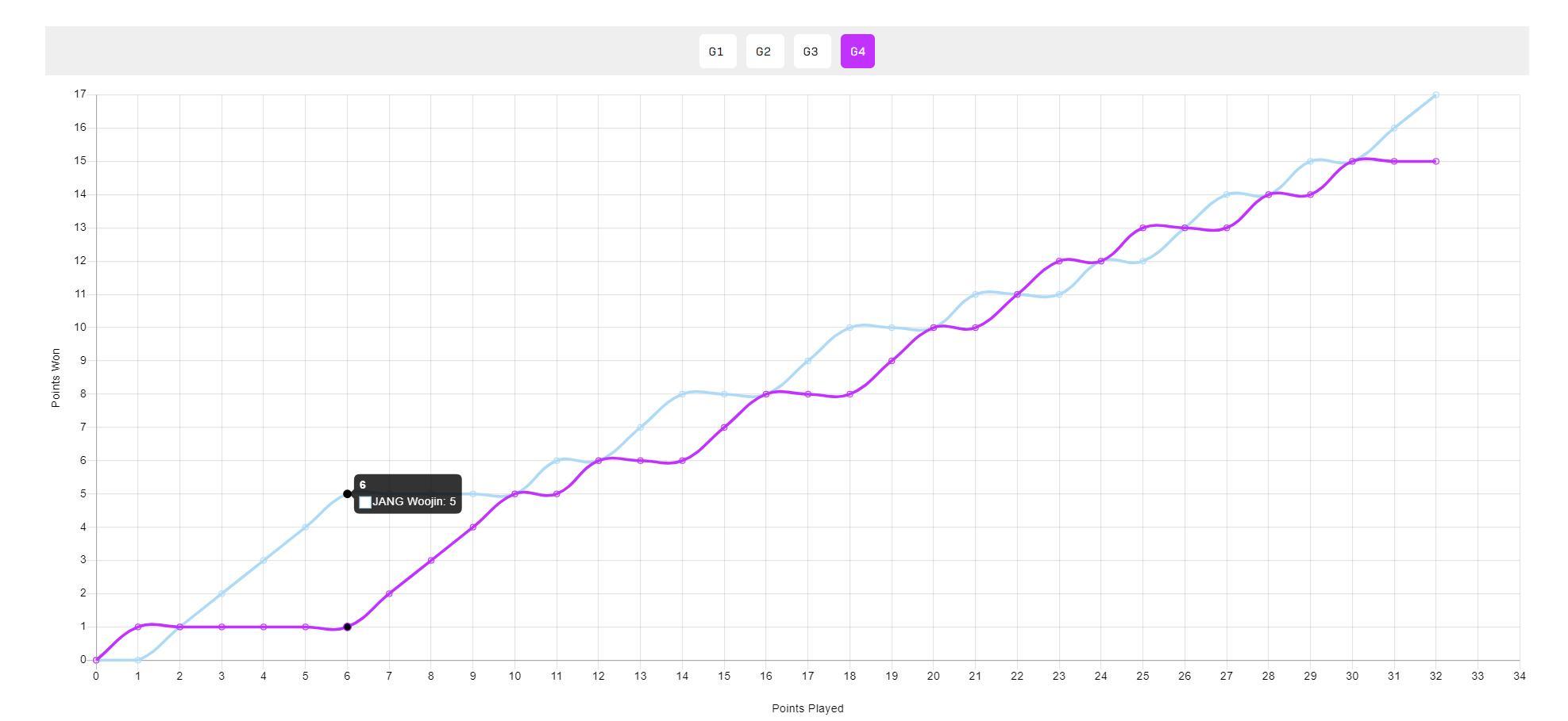張禹珍11-10再度拿到賽點,戶上又拯救賽點11-11,戶上12-11反局點,張禹珍又扳平12-12,戶上13-12再拿局點,張禹珍13-13扳平,張禹珍14-13第四個賽點,戶上繼續挽救賽點,張禹珍15-14第五個賽點,戶上挽救了五個賽點,最終張禹珍17-15艱難取勝。