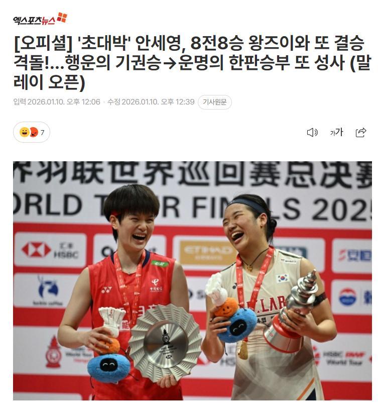 北京時間1月10日,韓國媒體《世博新聞》寫道:宿命的對決再度上演,陳雨菲的退賽讓安洗瑩決賽繼續對陣王祉怡,安洗瑩目前面對王祉怡是一波8連勝。