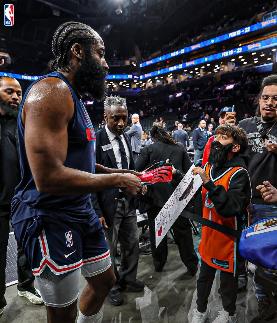 哈登曾爲這座城市鏖戰兩個賽季,他拖着腿筋拉傷的腳努力扛着這支球隊前行,所以當籃網交易哈登時沒有籃網球迷責怪他,每當他回到這裏都會有球迷爲他加油。此役之前一位小球迷拿着支持哈登的展板還帶着大鬍子來應援,哈登暖心的送上了簽名球鞋。