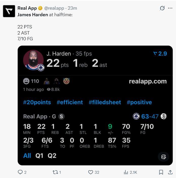 上半場哈登只打了18分鐘,10中7+三分3中2+罰球6中6,拿到22分2助攻1籃板1搶斷1蓋帽,命中率70%,三分命中率66.7%,真實命中率87%,他讓籃網球迷看到了巔峯登再現。