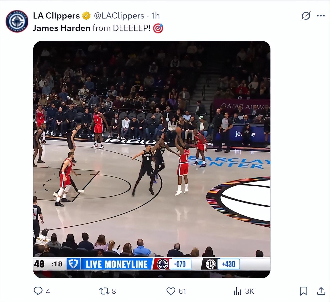 全場比賽哈登34分鐘,13中10,三分4中3,罰球8中8,拿到31分6助攻4籃板1搶斷2蓋帽,命中率76.9%,三分命中率75%,真實命中率93.8%,正負值+9。