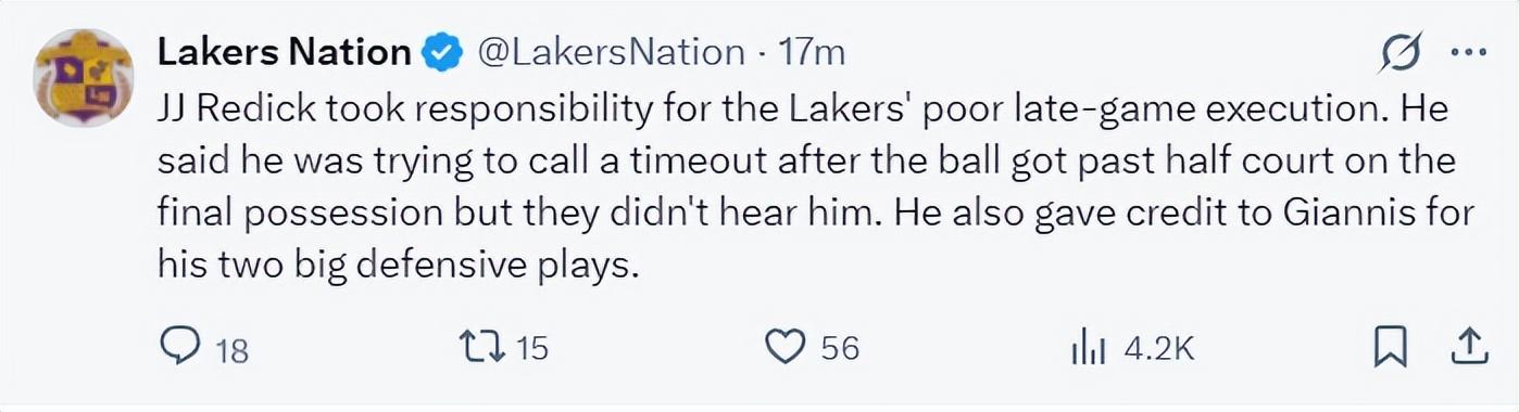 湖人101-105逆轉雄鹿失敗,這場比賽湖人一度落後雄鹿12分,末節在詹姆斯的爆發下完成反超,可進入決勝時刻湖人攻防兩端都斷電了,尤其是16.2秒東契奇送三分犯規後,雷迪克手握2個暫停都不叫暫停,結果導致詹姆斯被揚尼斯搶斷葬送比賽,詹姆斯被推上風口浪尖。