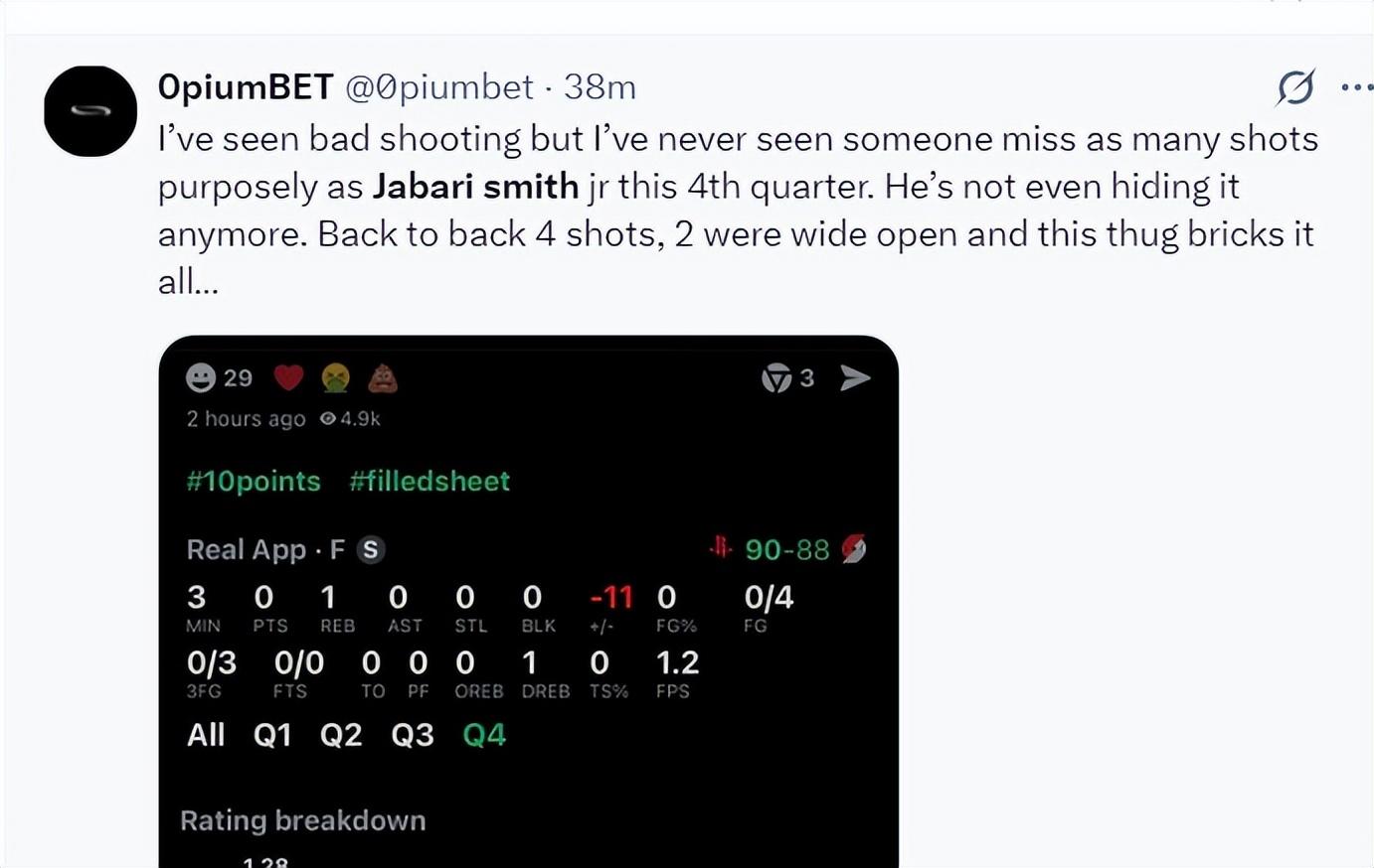 這場比賽火箭的第一罪人小賈巴里-史密斯,末節8中0+三分7中0,決勝時刻三個大空位三分打鐵,全場比賽41分鐘,21中6+三分10中0+罰球2中1拿13分8籃板1助攻2搶斷3蓋帽1失誤,真實命中率29.7%,正負值-19。