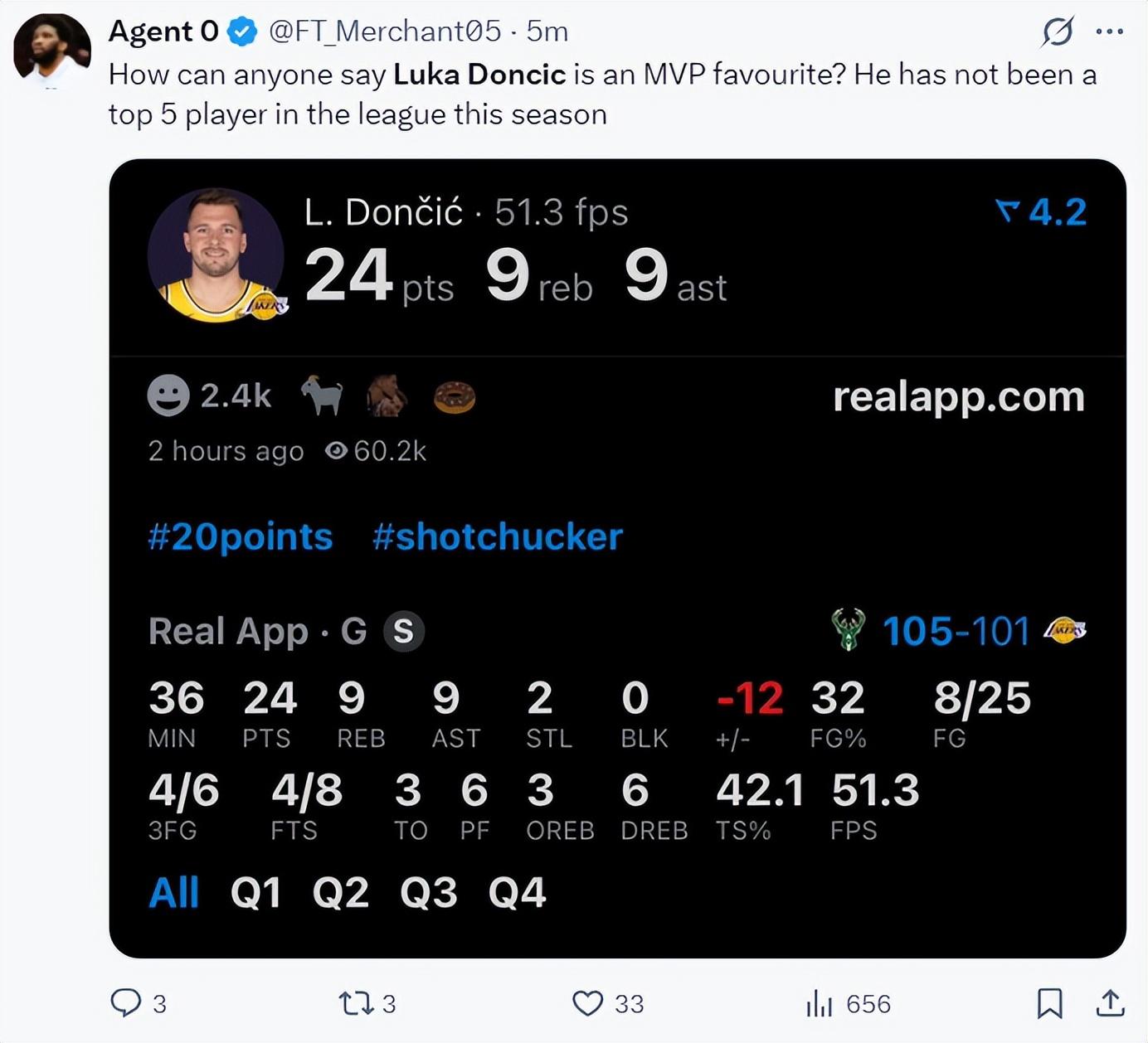 全場比賽東契奇36分鐘,25中8,三分6中4,罰球8中4,拿到24分9籃板9助攻2搶斷6犯規3失誤,命中率32%。美媒:竟然有人說東契奇是MVP候選人?他能進入前五嗎?