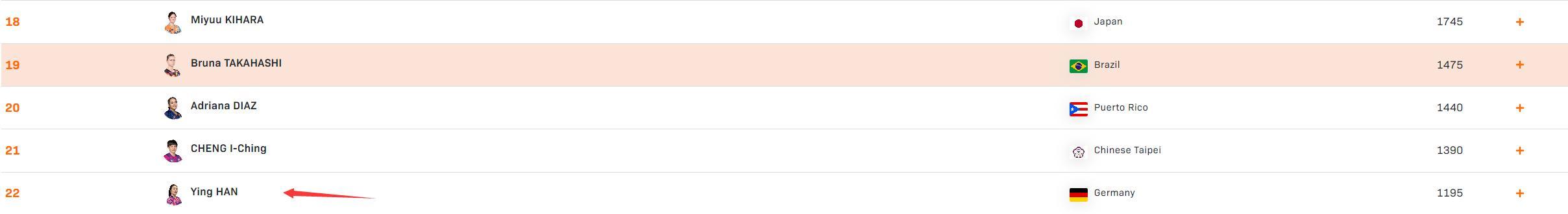 42歲的削球老將韓瑩參與這屆多哈冠軍賽前積分分1195分,她晉級四強可以拿到450分,那麼她的世界排名可以從第22升至第19,這對於42歲的韓瑩來說也算是里程碑的時刻,未能一黑到底也算本次多哈冠軍賽的大贏家了。
