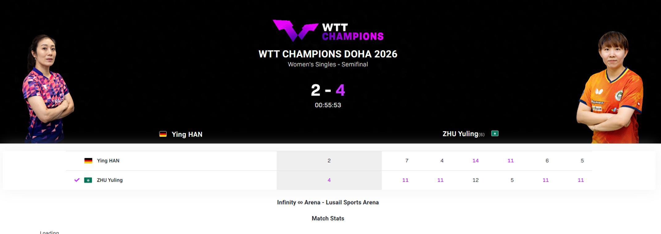 1.韓瑩以42歲256天成爲WTT冠軍賽進入四強最年長的選手;
