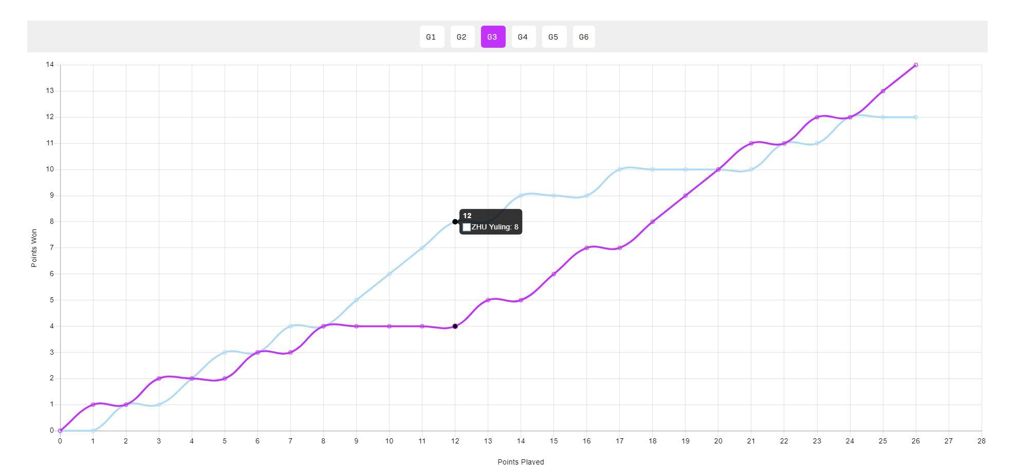 這場比賽我們依舊要對42歲的韓瑩脫帽致敬,她在大比分0-2落後朱雨玲的情況下沒有崩盤,第三局朱雨玲一度8-4領先,韓瑩努力追到10-10、11-11、12-12,最終14-12扳回一局,42歲的老將體能是一點沒影響。