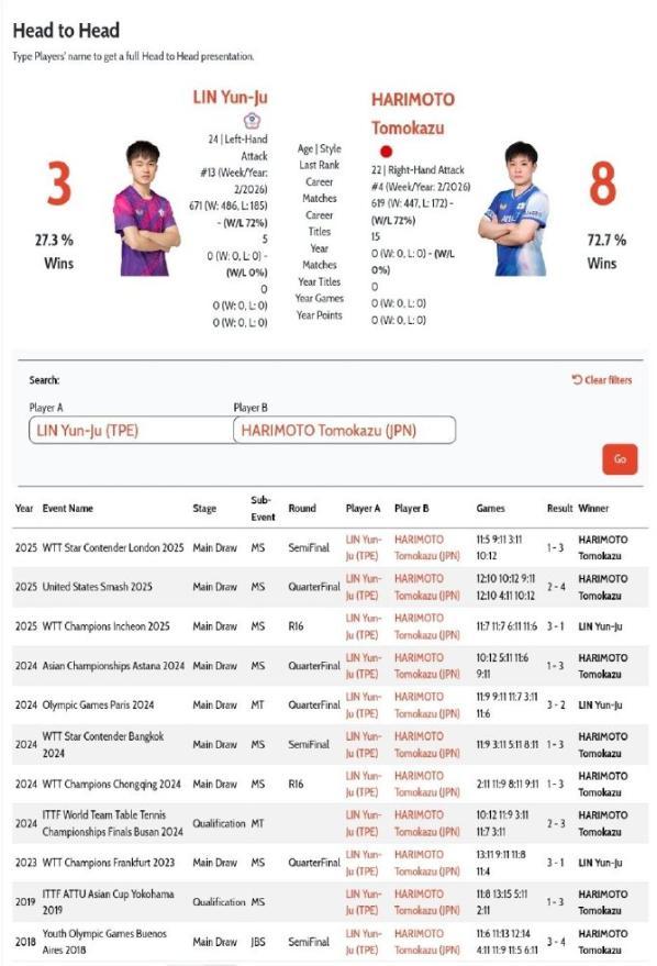 這場男單半決賽之前,兩人有過11次交手,林昀儒是3勝8負,換言之張本智和手握絕對的心理優勢,兩人在倫敦球星挑戰賽張本智和是3-1輕取林昀儒,沒想到2026賽季的第一次交手張本智和就輸了,這讓張本智和的豪言變得非常可笑。