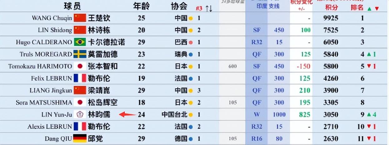 林昀儒拿到這個男單冠軍後,他也+825分,總積分3050直接從世界排名第13升至世界排名第九,大勒、邱黨都被他反超。