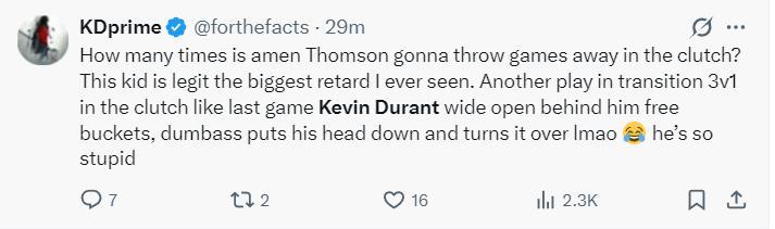 賽後休媒炮轟阿門-湯普森在關鍵時刻兩次低級失誤送國王6分,他認爲阿門的選擇太愚蠢,KD就在他身後無人防守他都能傳丟。