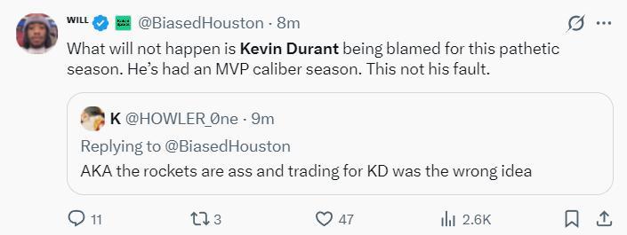 一位火箭球迷認爲球隊煞費苦心的交易得到杜蘭特,最終戰績還不如上賽季的太陽,太搞笑。