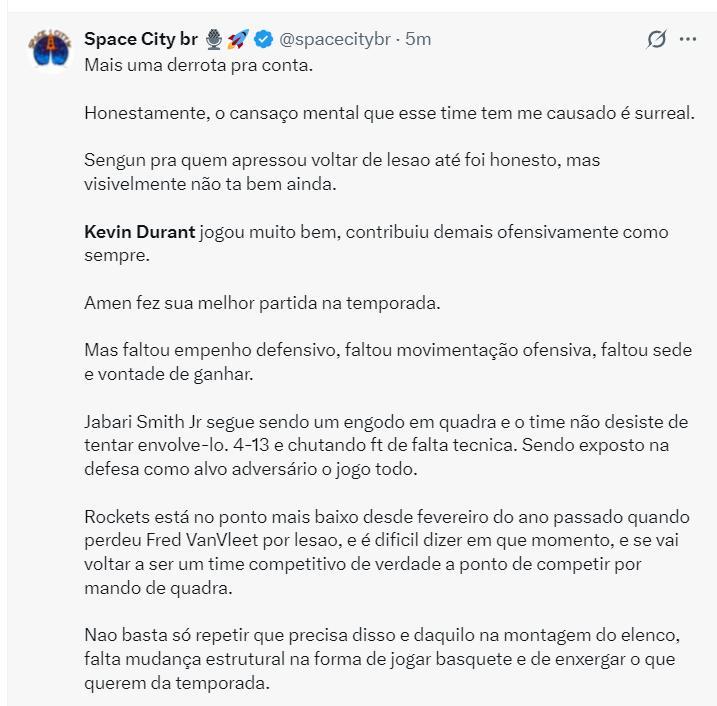 休媒總結了一下最近的三連敗:我認爲這支球隊的精神疲憊纔是關鍵,申京明顯還沒有痊癒就復出,杜蘭特依舊打得不錯,阿門險些打出賽季最佳一戰雖然略有瑕疵,可全隊缺乏防守強度,沒有進攻積極性,缺乏對勝利的渴望。