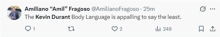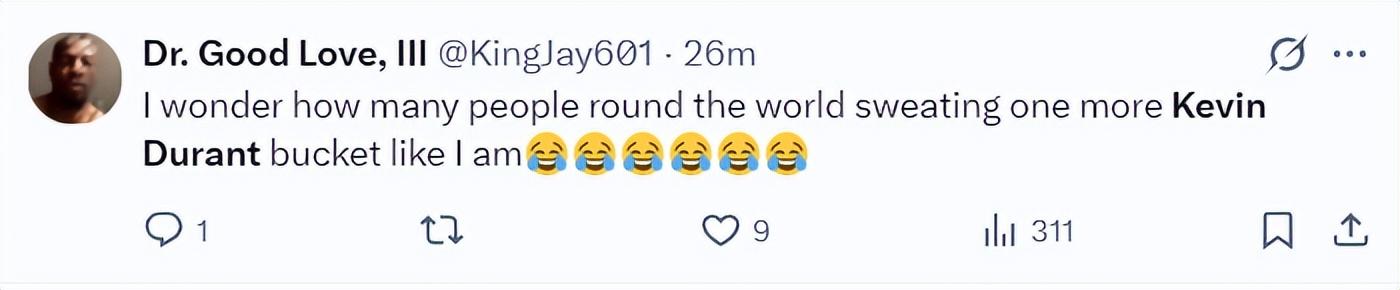也有火箭球迷認爲杜蘭特的肢體語言太沮喪了。(第三節打了10分鐘只有2個出手戰意全無)