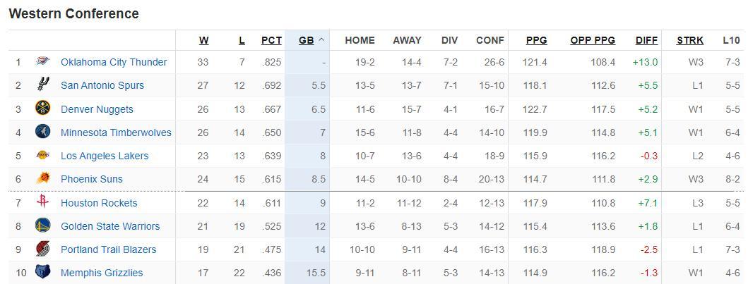 隨着火箭隊一波三連敗,太陽隊一波三連勝,太陽24勝13負,火箭22勝14負,太陽反超火箭成爲西部第六,而火箭則跌入附加賽成爲西部第七。