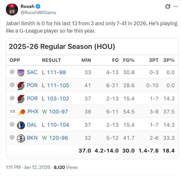 進入2026年後火箭隊的6場比賽,小賈合計83中25,三分球41中7,命中率30%,三分命中率18.4%,這個表現真的尷尬到極點,要知道他是一位身高2.11米,臂展2.2米的大前鋒啊!他NCAA的球探報告就是能投三分、能護框、兼具運動能力的空間型四號位,結果就這?