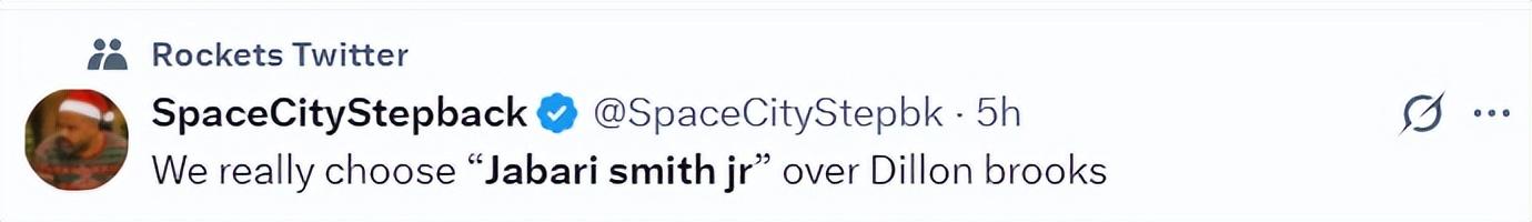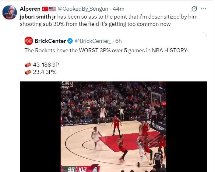 美媒寫道過去五場比賽,火箭三分球188中43,三分命中率23.4%是歷史最低,火箭球迷轉推後寫道:小賈的表現太糟糕了,以至於他投出30%的命中率我都習以爲常,這種情況已經屢見不鮮。