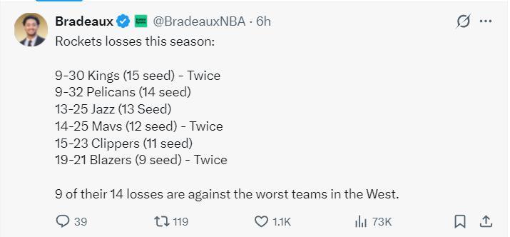 火箭接連輸給西部15的國王兩次,輸給西部第12的獨行俠兩次,輸給西部第九的開拓者兩次,還輸給西部14的鵜鶘、西部13的爵士,西部11的快船,火箭隊14場失利有9場是輸給弱旅。