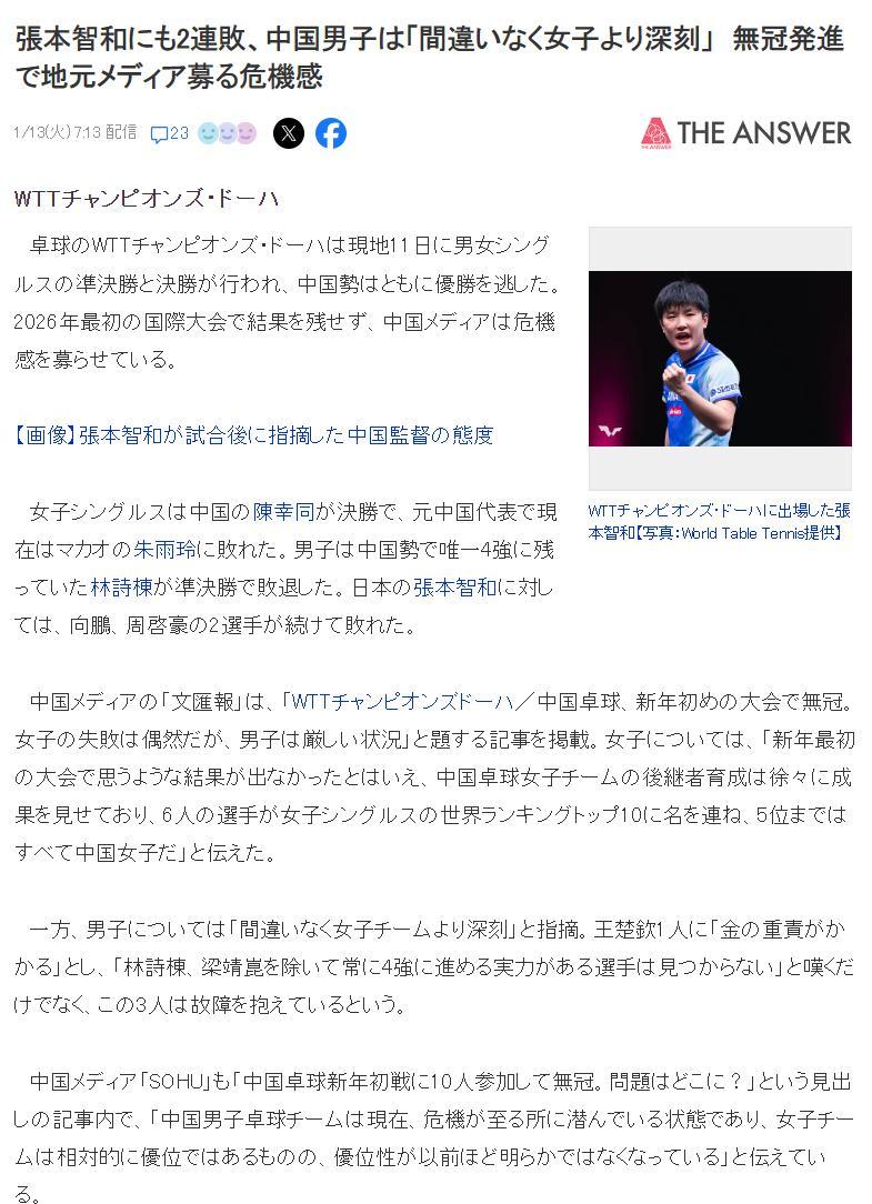 北京時間1月13日,日本媒體《The Answer》撰文:中國男隊連敗張本智和,中國男隊的問題比女隊更加嚴峻,開年無冠讓當地媒體都有危機感。