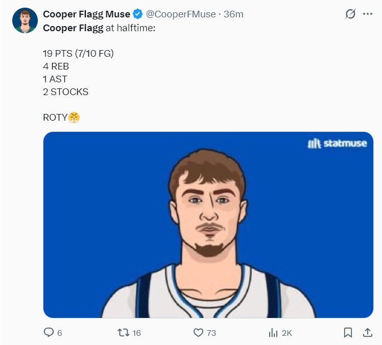 次節弗拉格更爲爆炸,單節5中5+罰球2中2,各種高難度的後仰跳投命中,單節12分4籃板1助攻1蓋帽,半場弗拉格17分鐘,10中7+三分1中1,拿到19分4籃板1助攻1搶斷1蓋帽,獨行俠媒體盛讚最佳新秀。
