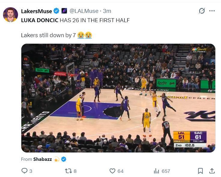 太慘烈了,蒙克一人比湖人全替補都要厲害,蒙克10分鐘已經拿到15分,而湖人四個替補合計4分,湖人第二節打了一半纔拿37分(詹東27分),湖人落後西部倒數第二的國王14分了。東契奇只能各種造犯規穩定戰局,蒙克三分5連中全場歡呼,東契奇完成了一個拋投的準壓哨三分,單節15分3助攻2籃板幫助湖人迫近比分,半場東契奇14中10拿到26分5助攻3籃板1搶斷。