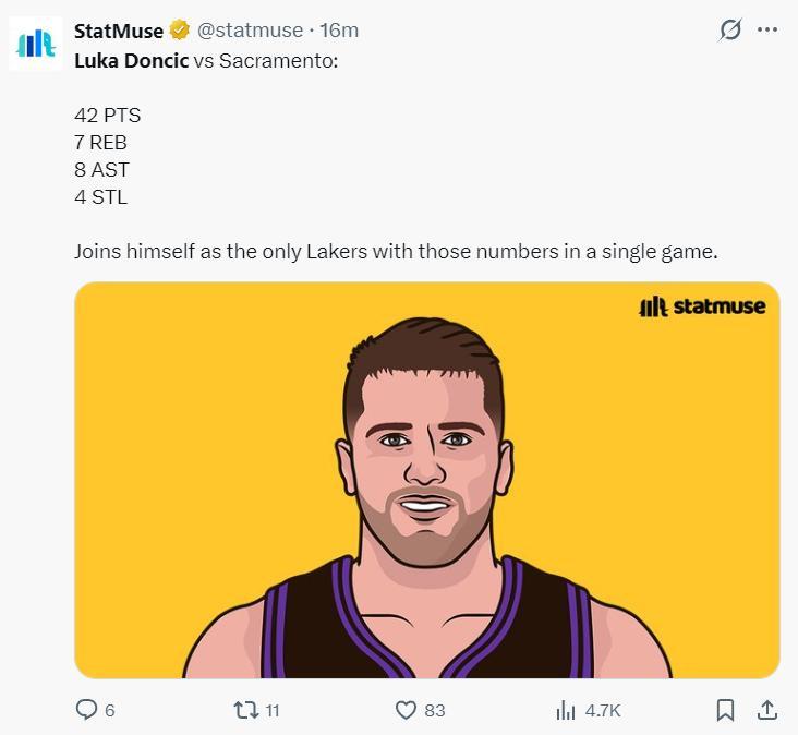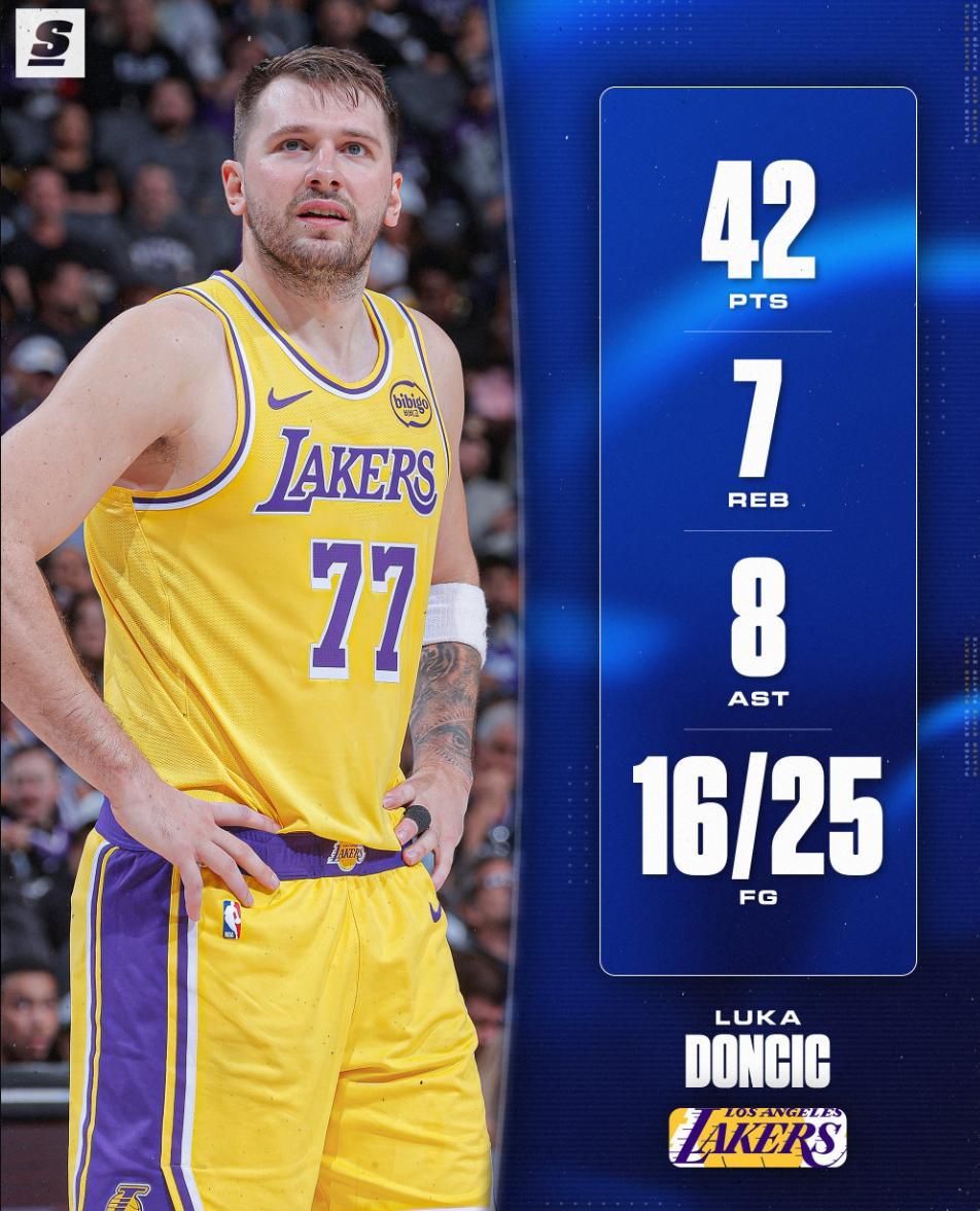 美媒:東契奇是湖人隊史第一位單場至少42+8+7+4搶斷的數據。