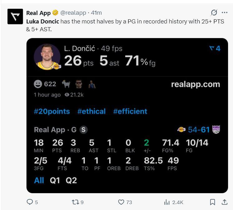 東契奇半場拿到25+5助攻,他已經是有數據記錄後控球后衛中最多25分+5助攻的球員。