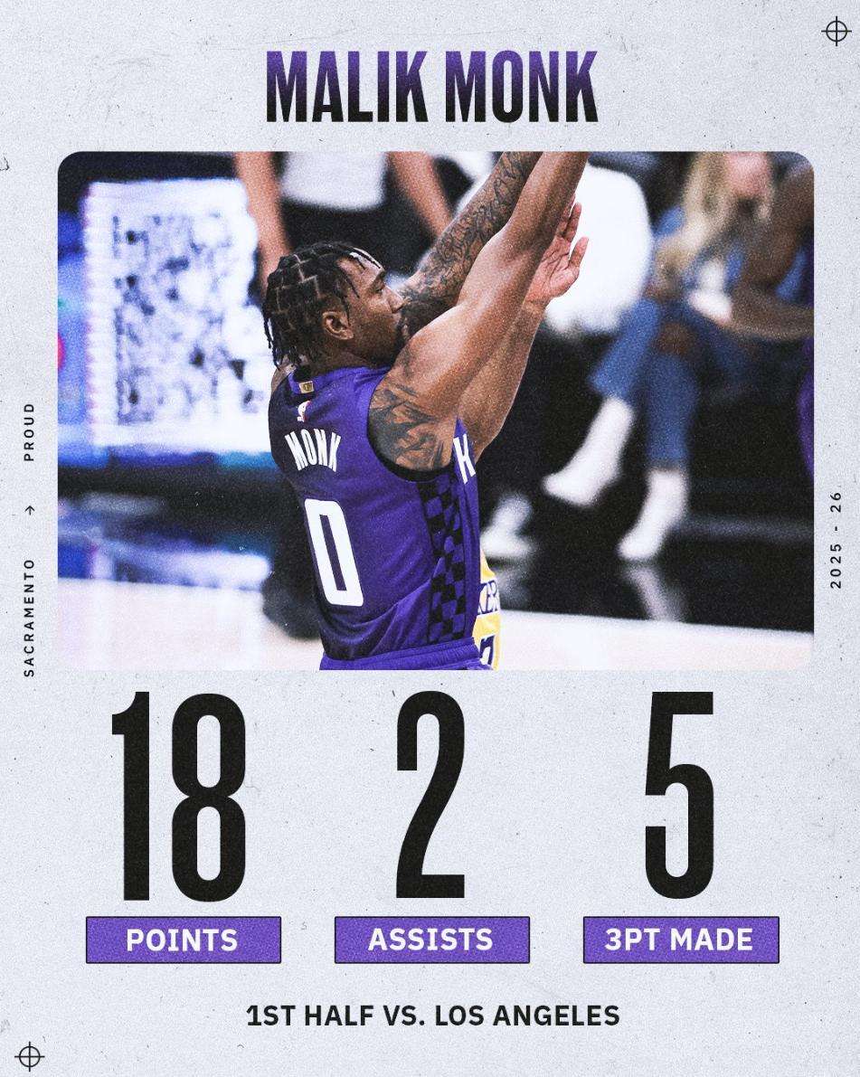 蒙克32分鐘,15中9,三分9中7,拿到26分(賽季新高)8助攻1籃板1搶斷,命中率60%,三分命中率77.8%。