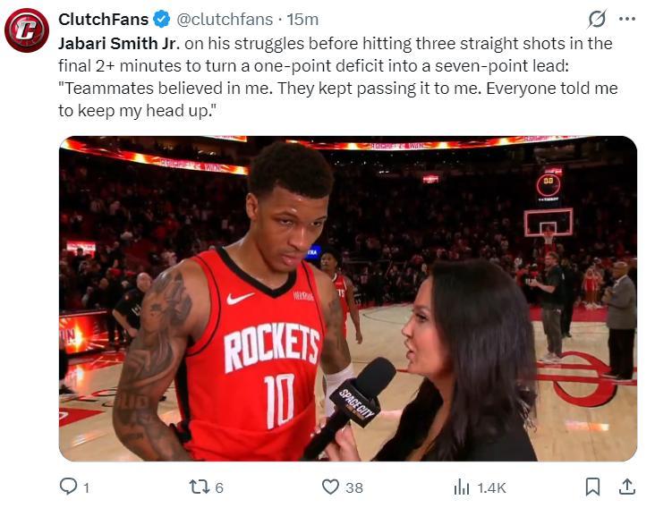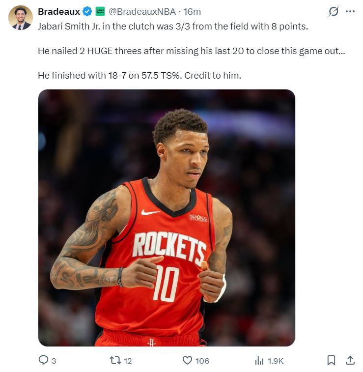 火箭記者Bradeaux寫道:這場比賽史密斯在決勝時刻3中3拿到8分,他在連續投丟了20個三分球后完成了三分2中2,他的三分球終結了比賽,他最終拿到18分,真實命中率57.5%值得稱道。